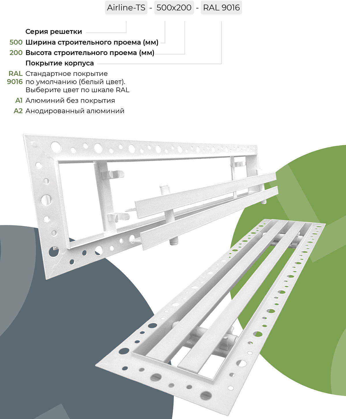 Щелевые решетки Airline-TS изготавливаются из экструдированного алюминиевого профиля АД31 по ГОСТ 22233-2001. По умолчанию корпус решетки окрашивается в стандартный белый цвет RAL 9016. По индивидуальному заказу возможна окраска в любой цвет по шкале RAL как корпуса, так и внутренней части.