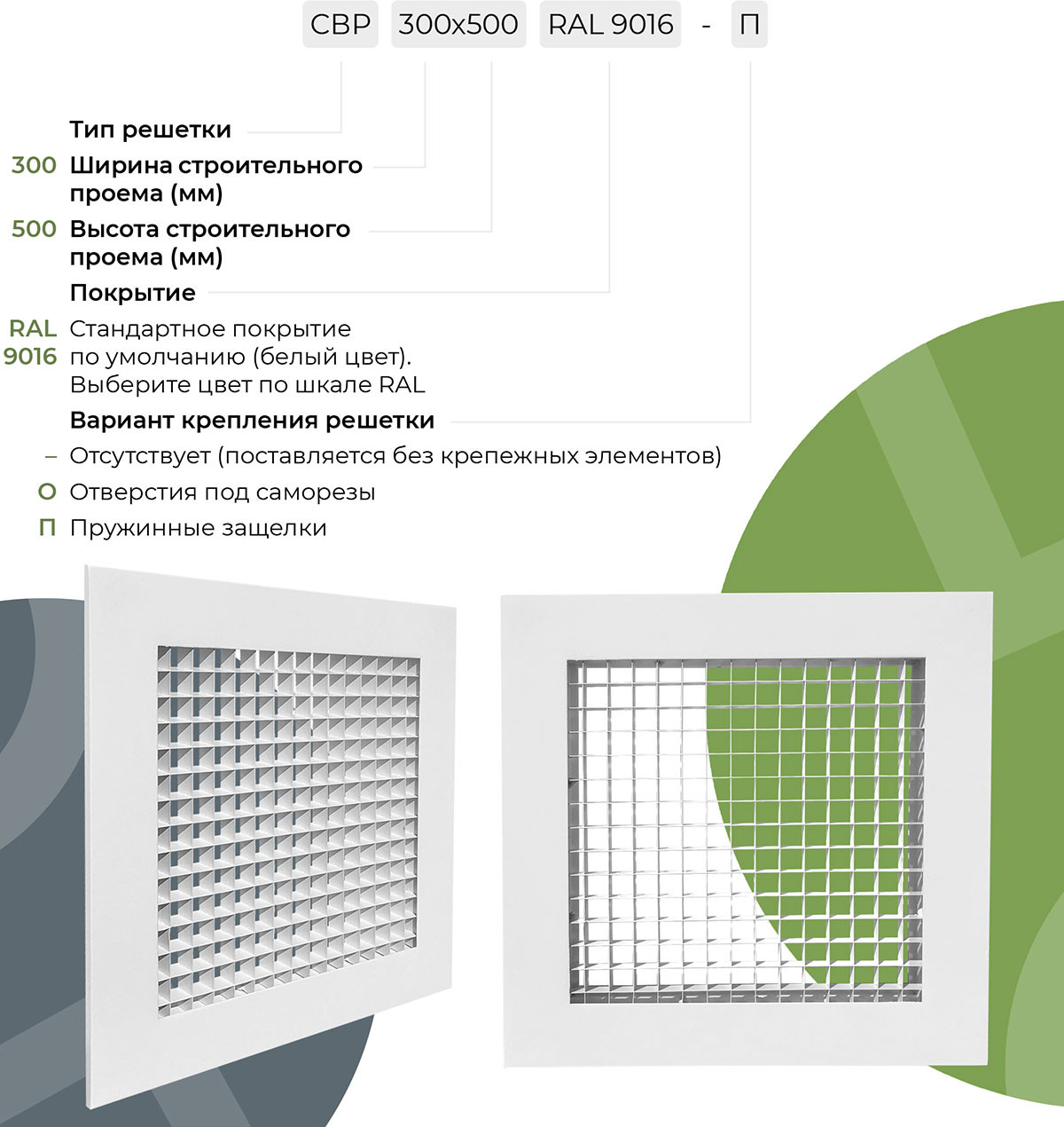 По дополнительному запросу решетки СВР могут быть оснащены пружинной защелкой для скрытого монтажа либо отверстиями, расположенными на лицевой стороне рамки для крепления с помощью винтового соединения. Предусмотрена возможность оснащения клапаном расхода воздуха и адаптером для присоединения к воздуховоду.